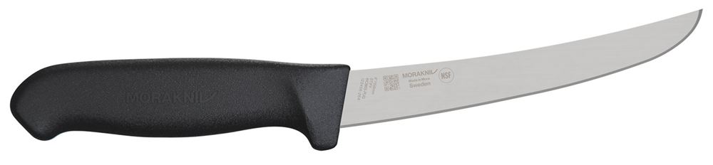 The curved Morakniv boning knife with a 16 cm (159 mm / 6 inch) stiff and wide blade is specially designed for precise work along the bone. The wide, curved blade shape enables clean, controlled cuts when deboning meat, whether in a butcher shop, slaughterhouse, or home kitchen.